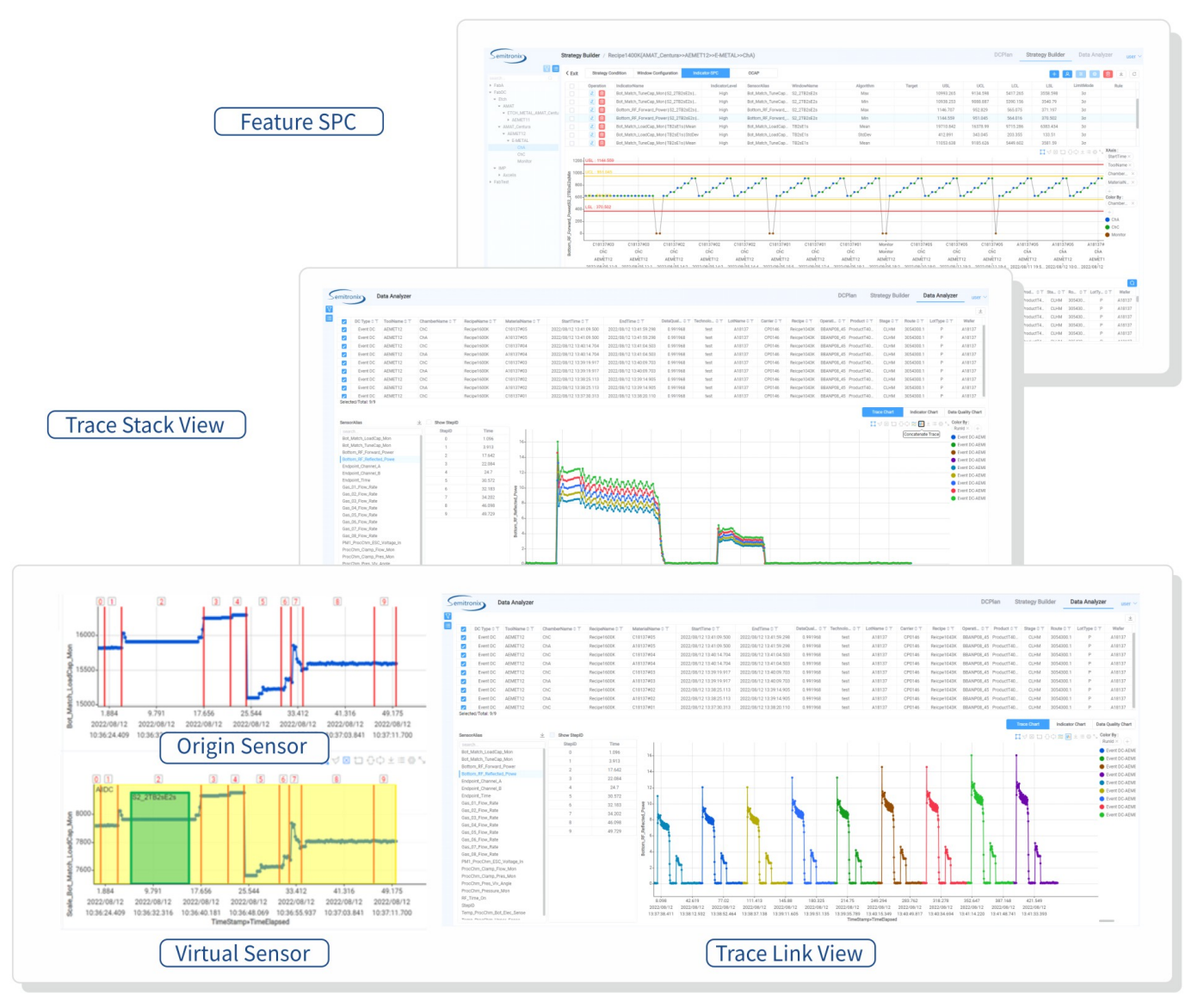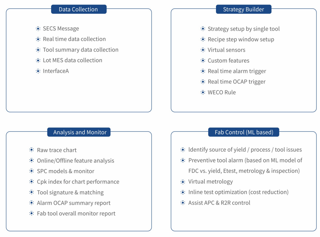 在制造过程中,设备效率和稳定性及工艺的一致性是确保高产品质量和产量的重要因素。广立微DataExp-FDC(简称DE-FDC)系统与设备及MES建立通讯,收集设备中传感器的 Raw Trace数据,并从中提取有效表征因子,监控整个生产过程中的设备运行,提供预警和实时调优,保证生产工艺的稳定性。同时FDC收集的大量设备数据和良率分析系统 (YMS)结合,通过大数据机器学习可以帮助快速找到良率问题的根因,并反馈到产线及时修正。除此之外,与Inine量测建立的有效模型,使Fab可及时调整采样策略,减少CycleTime和优化测量设备使用,在保证监控灵敏度的同时降低成本。