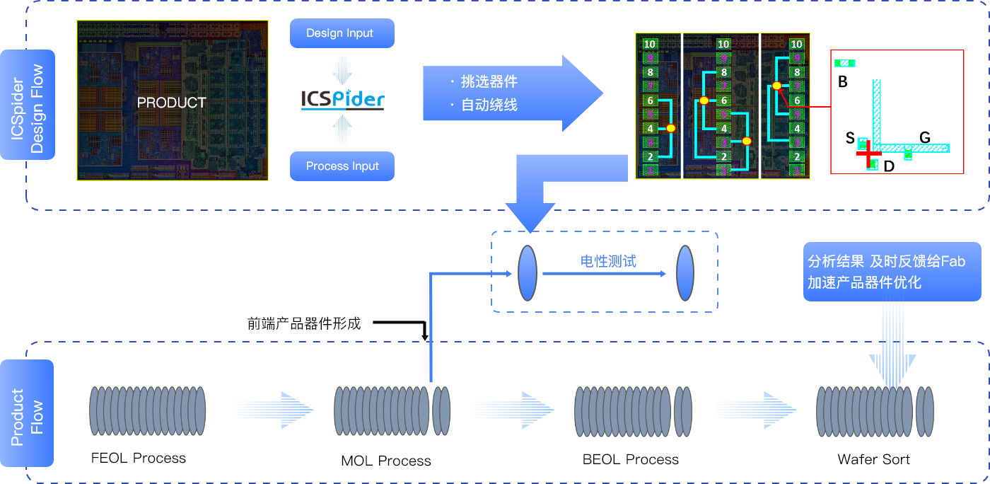 通过ICSpider,客户可以在保证产品芯片前道工艺层不变的前提下,用最少的代价改变后道工艺层,获取基于产品版图的器件电性参数,帮助客户更直观、高效、有针对性地提升产品成品率和性能指标。